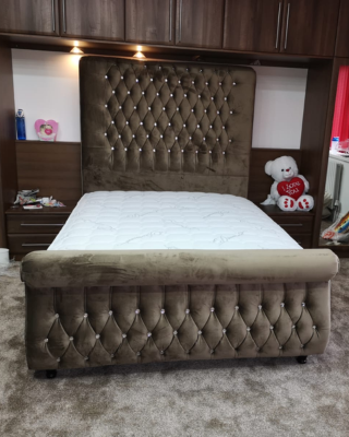 The Swan Sleigh Bed UK is the ultimate expression of traditional luxury and comfort. Featuring a majestic, extra-tall headboard with deep-buttoned Chesterfield tufting and sparkling diamante accents, this bed is designed to be the crown jewel of your bedroom. Its elegant scrolled footboard and plush velvet finish offer a timeless silhouette that brings royal sophistication to any UK home.